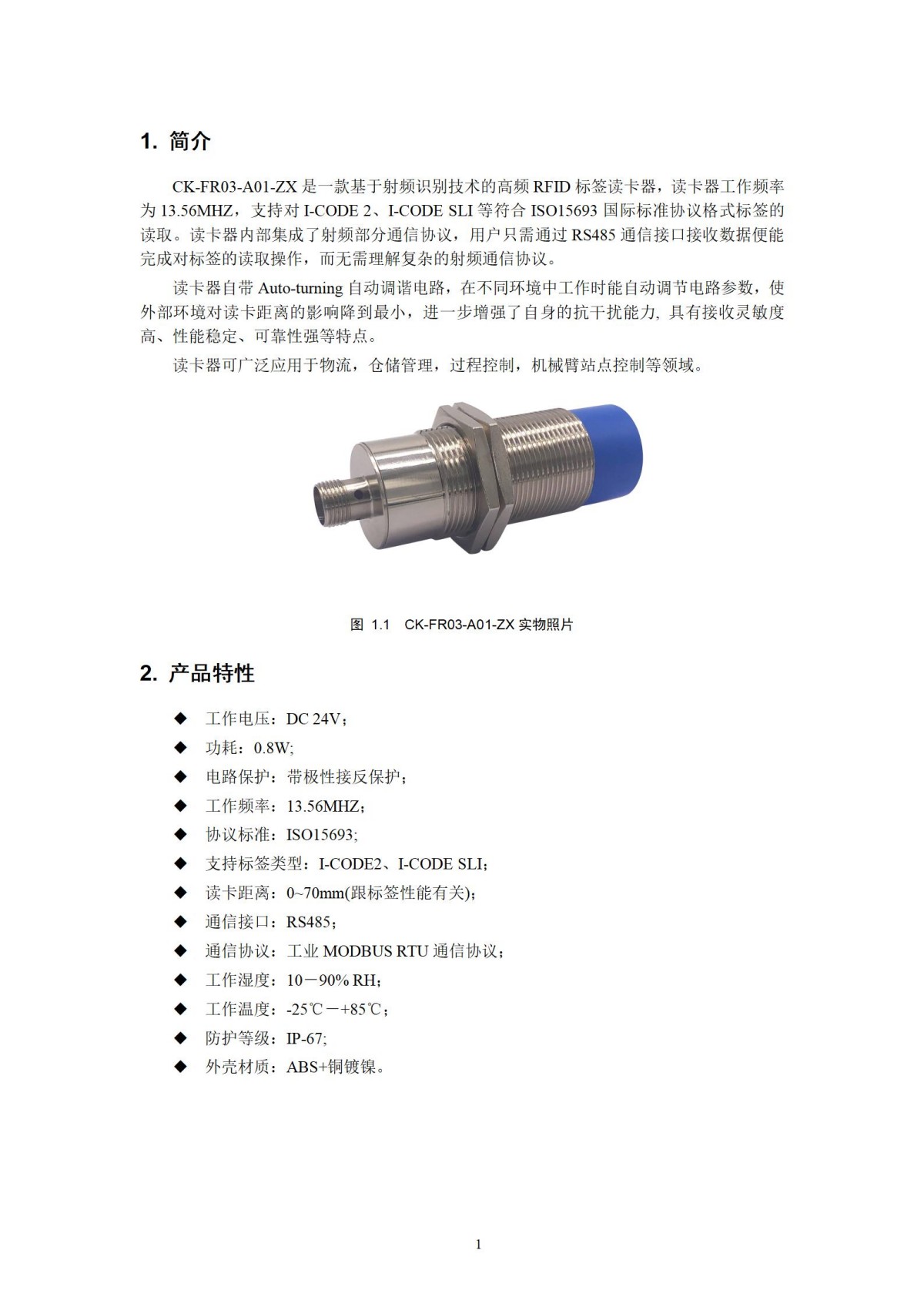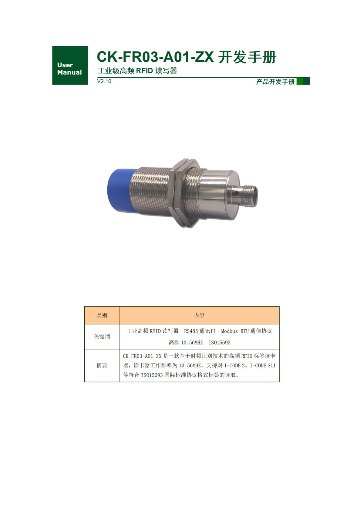 CK-FR03-A01-ZX是一款基于射頻識別技術的高頻RFID標簽讀卡器,讀卡器工作頻率為13.56MHZ,支持對I-CODE 2、I-CODE SLI等符合ISO15693國際標準協議格式標簽的讀取。