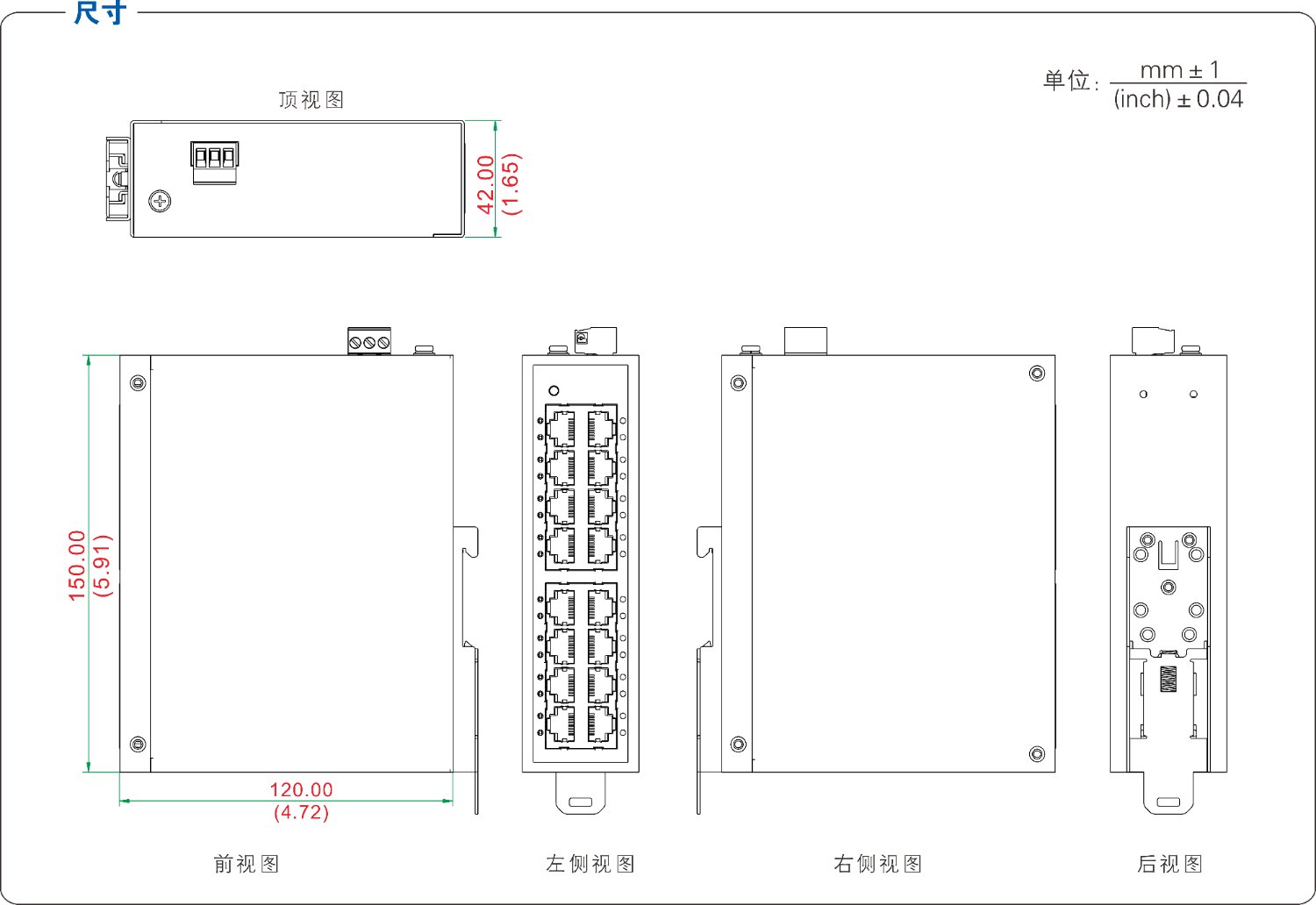 機械結構 | 外殼:IP40防護等級 安裝方式:導軌式/壁掛式安裝 重量:不大于1600g 尺寸(W x H x D):120mmx42mmx150mm |