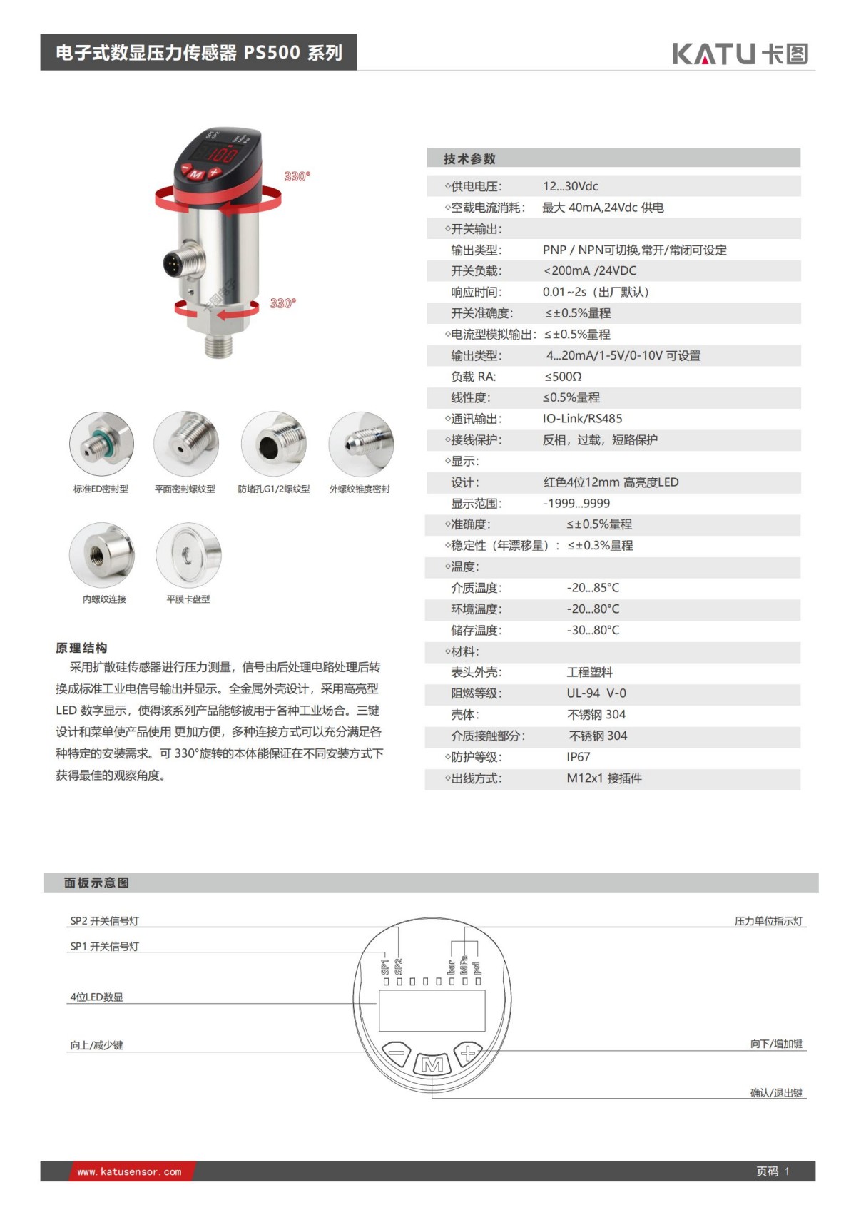 采用擴散硅傳感器進行壓力測量,信號由后處理電路處理后轉換成標準工業電信號輸出并顯示。全金屬外殼設計,采用高亮型LED數字顯示,使得該系列產品能夠被用于各種工業場合。三鍵設計和菜單使產品使用更加方便,多種連接方式可以充分滿足各種特定的安裝需求。可330°旋轉的本體能保證在不同安裝方式下獲得最佳的觀察角度。